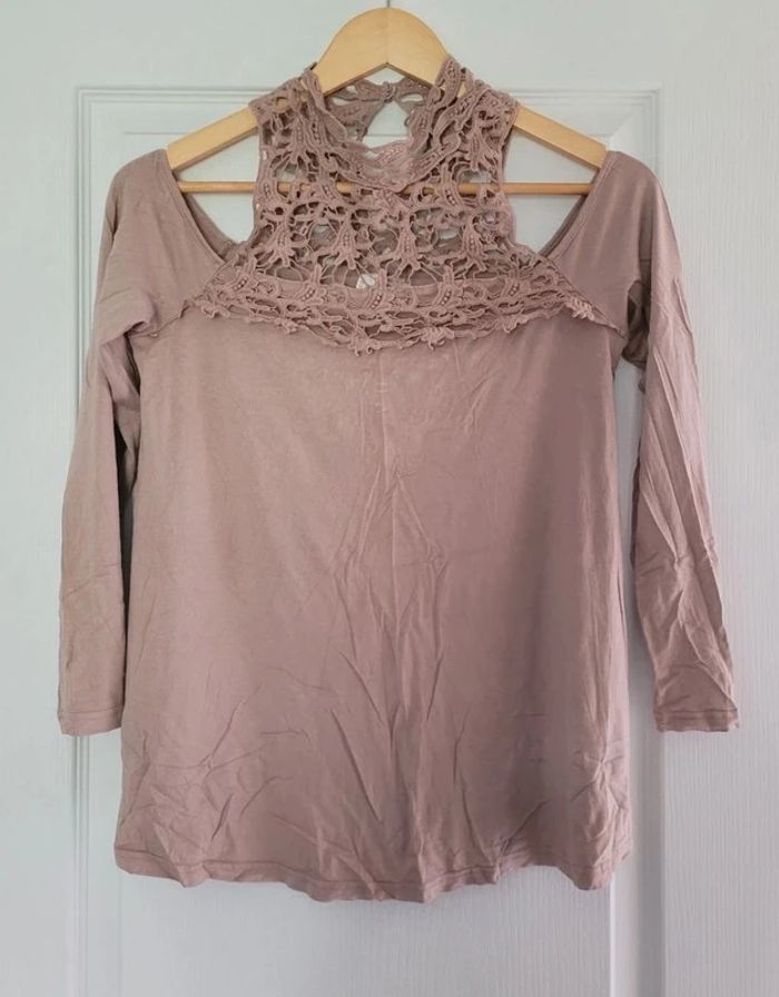 T-shirt manches longues, fluide, avec encolure en crochet et épaules dénudées, de couleur marron clair, de la marque Body Flirt, taille 38/40, en très bon état. Article lavé pour la vente. #40lae72