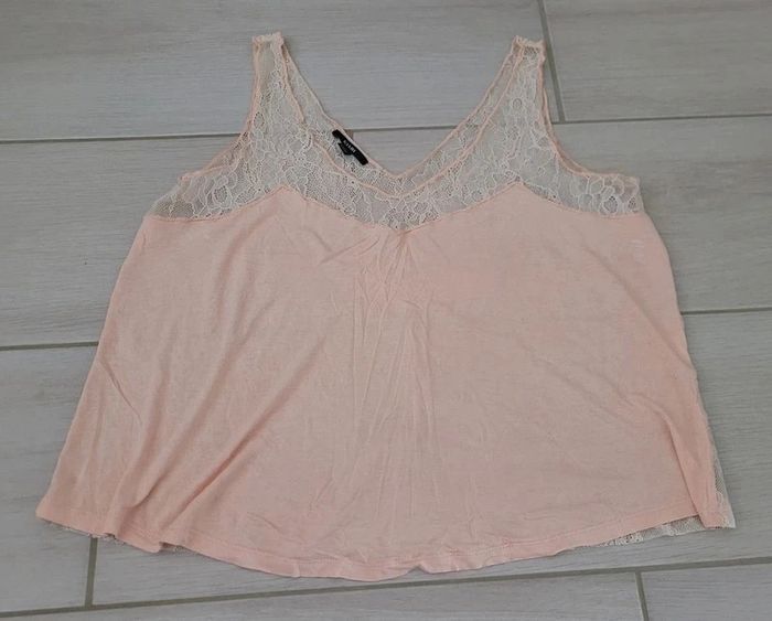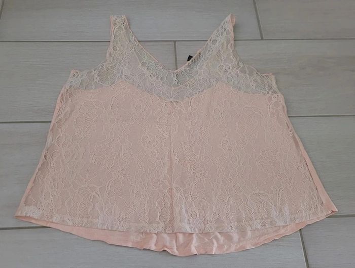 Débardeur fluide, dos entièrement en dentelle, de couleur rose poudré, de la marque Kiabi, taille M, en très bon état. Article lavé pour la vente. #38lae72