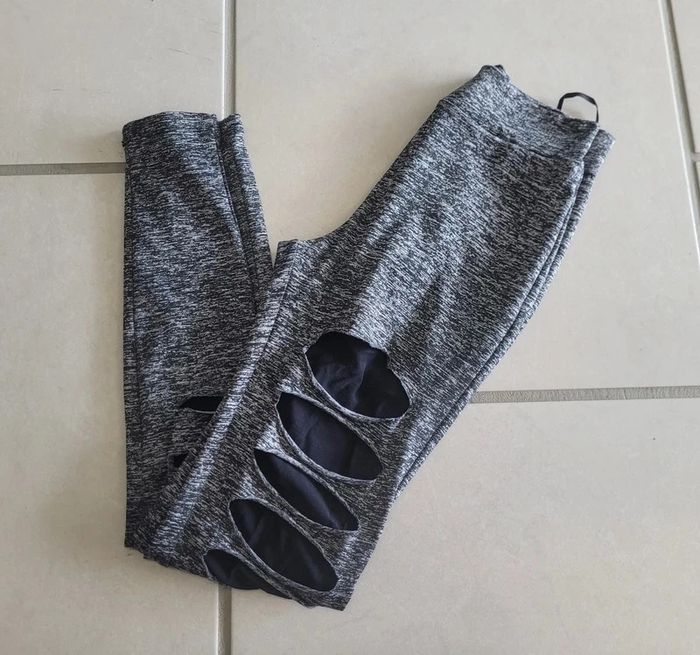 Legging de couleur gris avec ouverture au niveau des genoux avec transparence, taille XS, en très bon état. Article lavé pour la vente. #34lae72