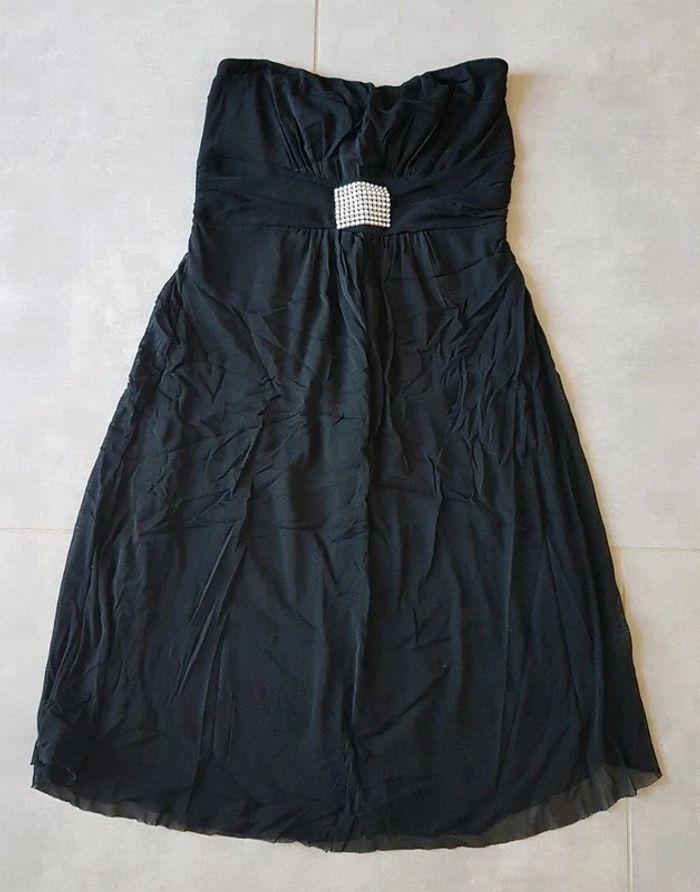 Robe courte noire sans bretelles, avec petits strass au centre de la poitrine, correspond à une taille L, en très bon état. Article lavé pour la vente.