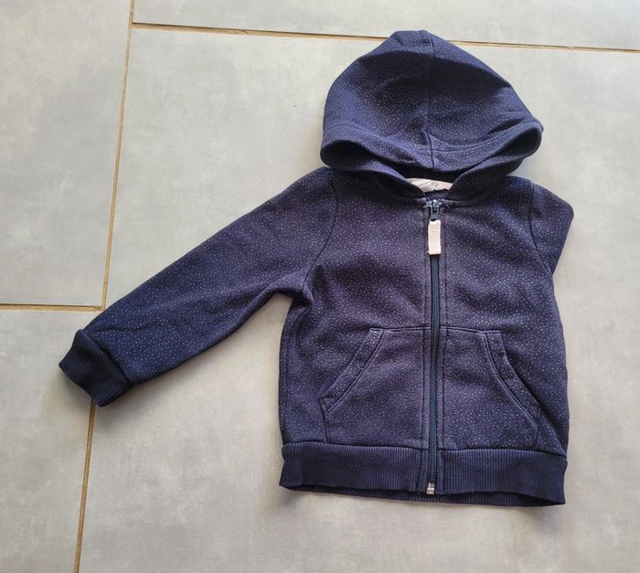Gilet zippé a capuche, de couleur marine a pois argentés, de la marque H&M, taille 24 mois (92 cm), en très bon état. Article lavé pour la vente. #24moislae72