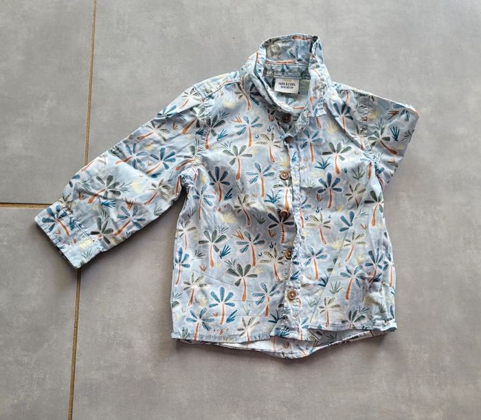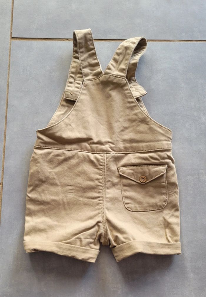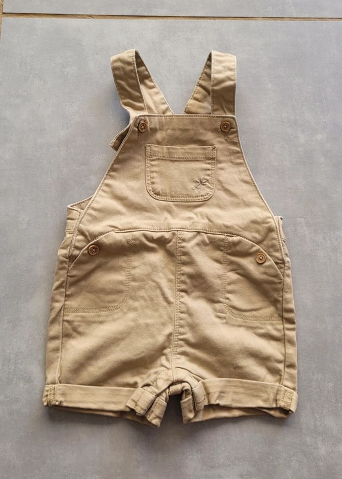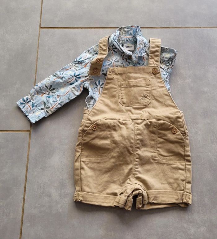 Ensemble salopette short en jean de couleur marron clair et chemise dans les tons bleus, de la marque Tape à l'œil, taille 18 mois (80 cm), en excellent état, ar très peu porté (erreur de saison). Articles lavés pour la vente. #18moislae72