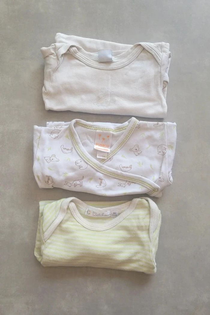 Lot de 3 bodys manches longues, dans les tons blancs et verts, un de la marque Kitchoun, un de la marque Pusblu (à ouverture devant) et un de la marque Petit Bateau, taille 6 mois, en très bon état. Articles lavés pour la vente. #6moislae72