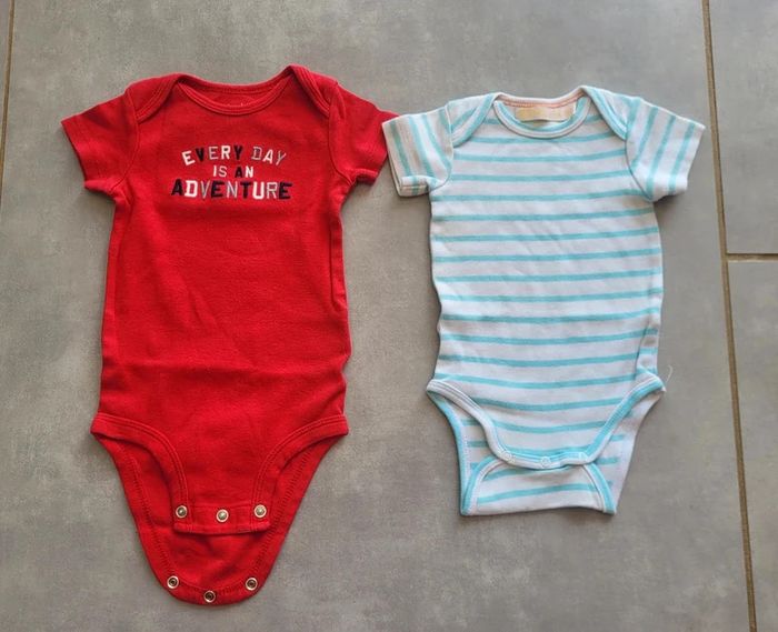 Lot de 2 bodys manches courtes, un rouge de la marque Simple Joys et l'autre blanc rayé bleu de la marque Gemo, taille 6 mois, en très bon état. Articles lavés pour la vente. #6moislae72
