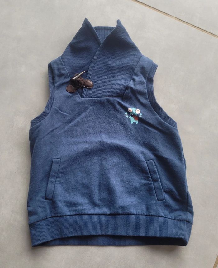Pull sans manches avec grand col, de couleur bleu, de la marque In Extenso, taille 24 mois (92 cm), en très bon état. Article lavé pour la vente. #24moislae72