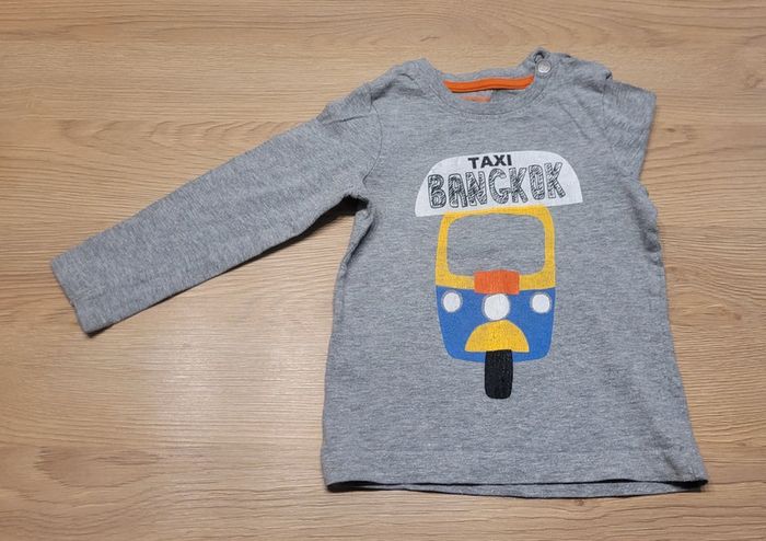 T-shirt manches longues, de couleur gris, avec motif taxi, de la marque Orchestra, taille 18 mois, en très bon état. Article lavé pour la vente. #18moislae72