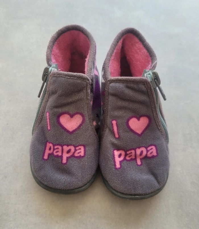 Chaussons dans les tons gris et violet, de la marque Tooti, taille 21, en très bon état. Article lavé pour la vente.