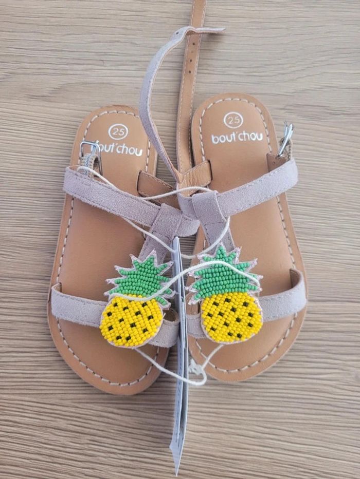 Sandales, sangle vieux rose avec motif ananas en perle, de la marque Bout'chou, taille 25, neuves. Juste essayées, mais ne va pas à ma fille. Achetées neuves 29.99€
