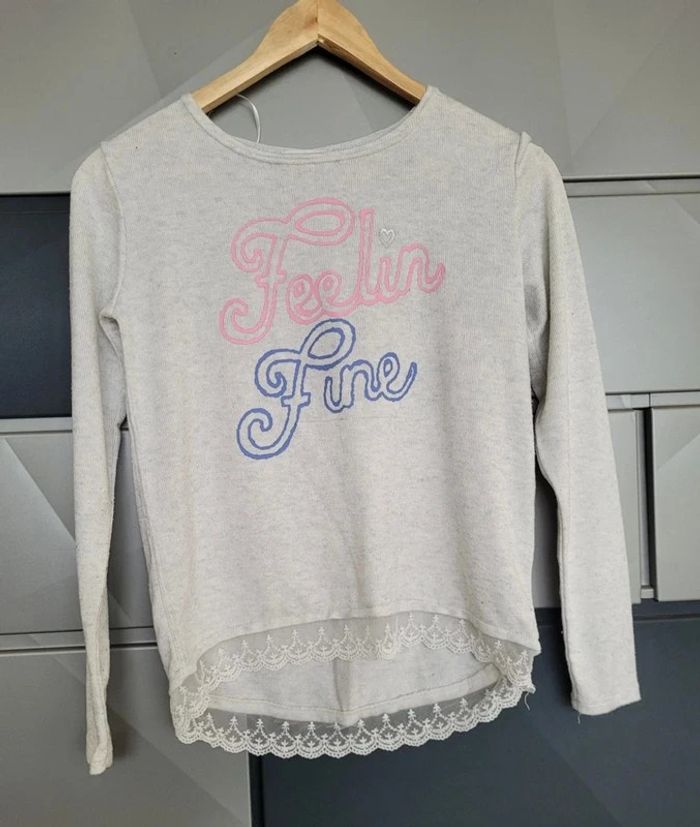 Pull souple, de couleur beige, avec inscription "Feelin Fine", léger défaut (fil tiré), détail dentelle en bas, de la marque H&M, taille 10-12 ans (146-152 cm), en très bon état. Article lavé pour la vente. #12anslae72