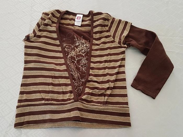 T-shirt ML, marron et or, 2 en 1, effet trompe l'oeil avec le petit gilet. Marque: C&A Taille 116/152 cm. Article lavé pour la vente #12anslae72