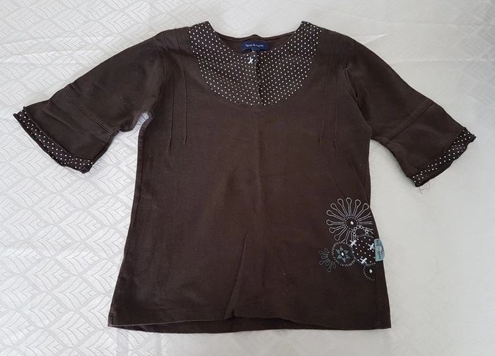 T-shirt MC, marron, col et extrémités des manches à pois. Marque: Terre de Marins Taille 10 ans. Article lavé pour la vente #10anslae72