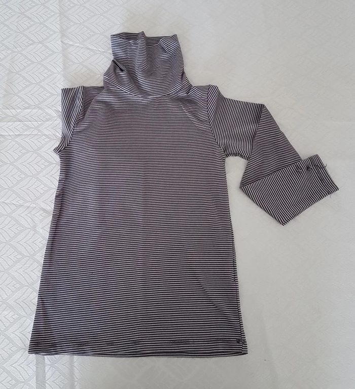 Sous pull, col roulé, gris rayé blanc, avec détails boutons au niveau des macnhes. Marque: NKY Taille 128 cm soit 8 ans. Article lavé pour la vente #8anslae72