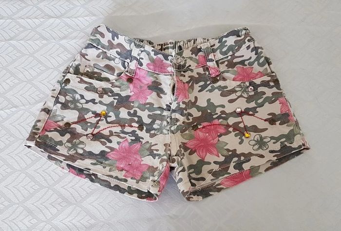 Short kaki, avec motifs fleurs. Marque: Q Q House Taille 7 ans. Article lavé pour la vente #7anslae72