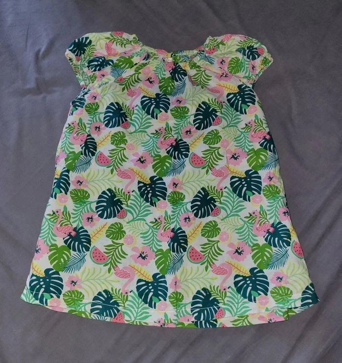 Robe fluide, sans manches, dans les tons vert et rose, motifs feuillage et flamand rose, de la marque H&M, taille 18-24 mois (92 cm), en très bon état. Article lavé pour la vente. #2anslae72