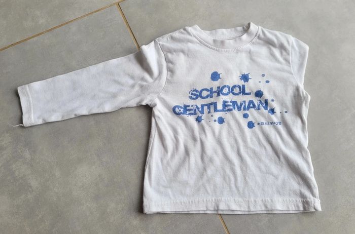 T-shirt manches longues, de couleur blanc avec inscription en bleu, de la marque Orchestra, taille 2 ans (92 cm), en très bon état. Article lavé pour la vente. #2anslae72