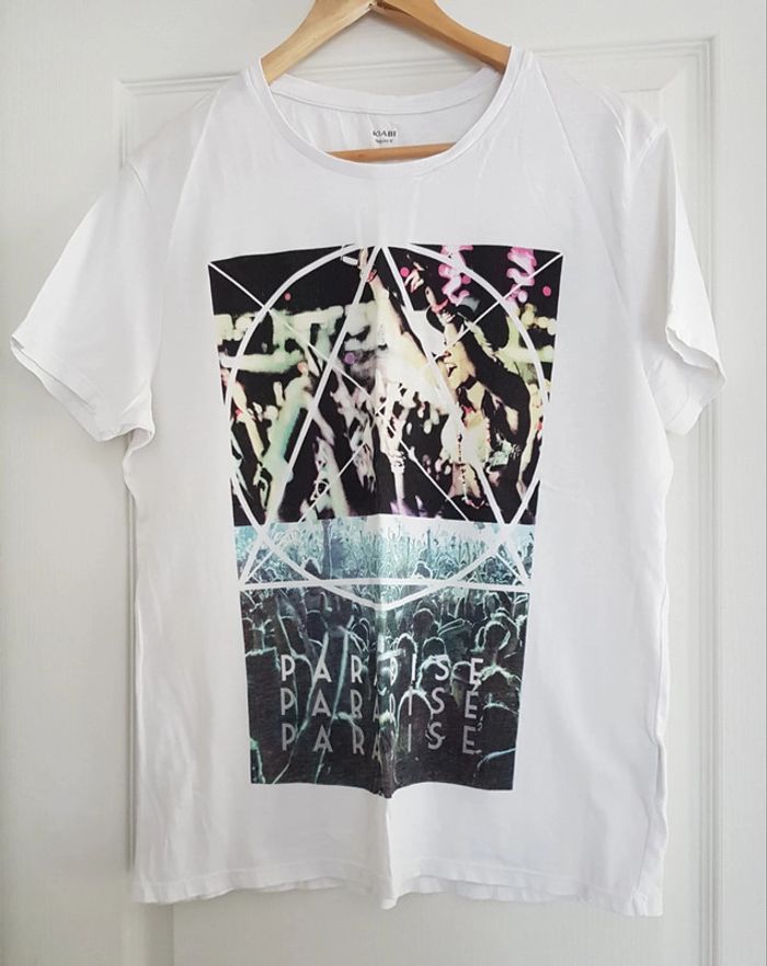 T-shirt manches courtes, de couleur blanc avec motif, de la marque Kiabi, taille L, en très bon état. Article lavé pour la vente.