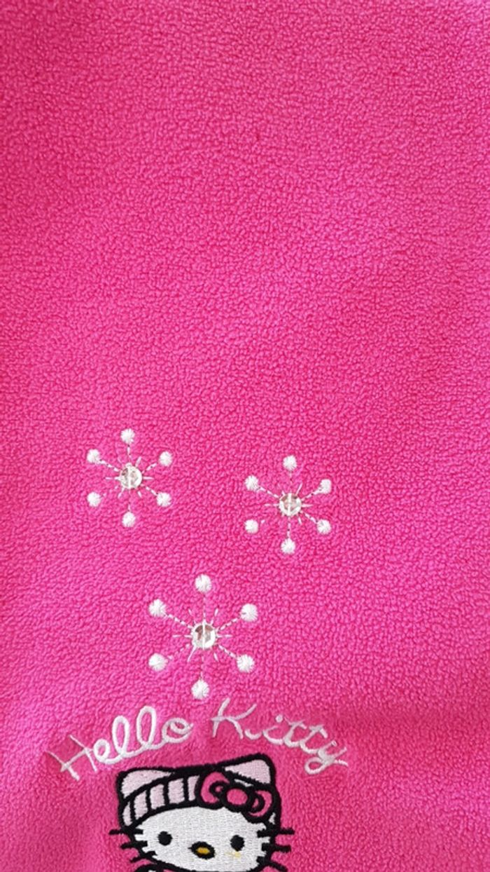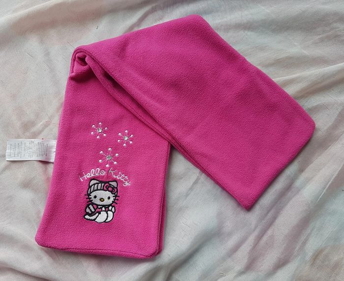 Écharpe polaire rose, de la marque Hello Kitty, taille unique, en très bon état. Juste un petit accroc au dessus du motif. Article lavé pour la vente.