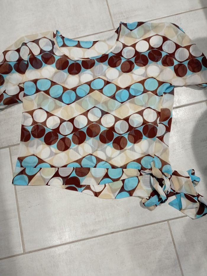 Vends un tee-shirt manches courtes léger. Il faut mettre un débardeur dessous car c est un peu transparent