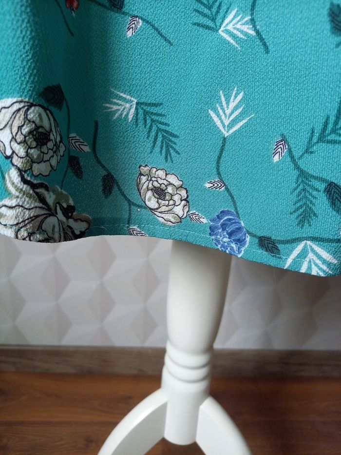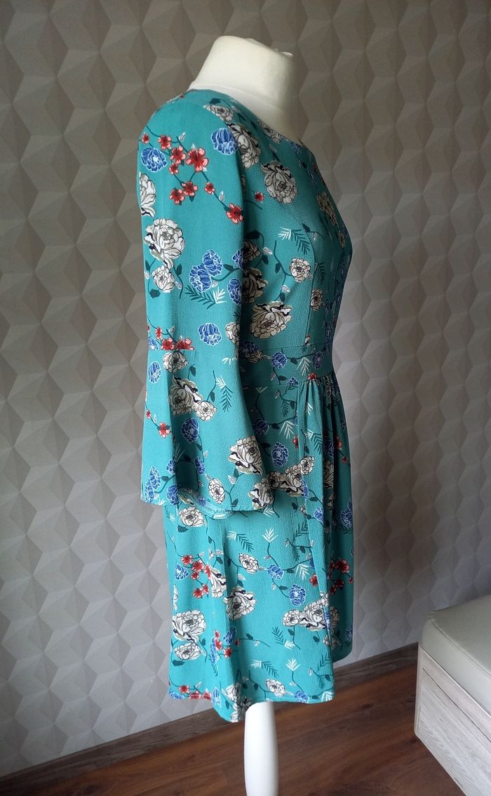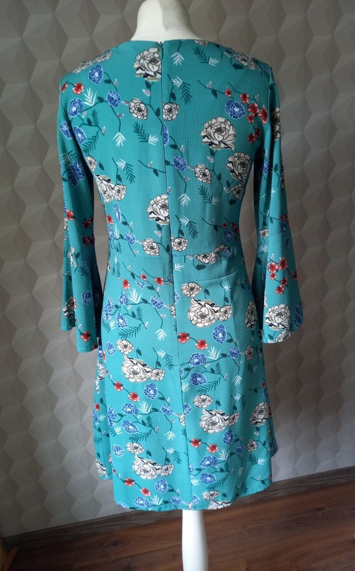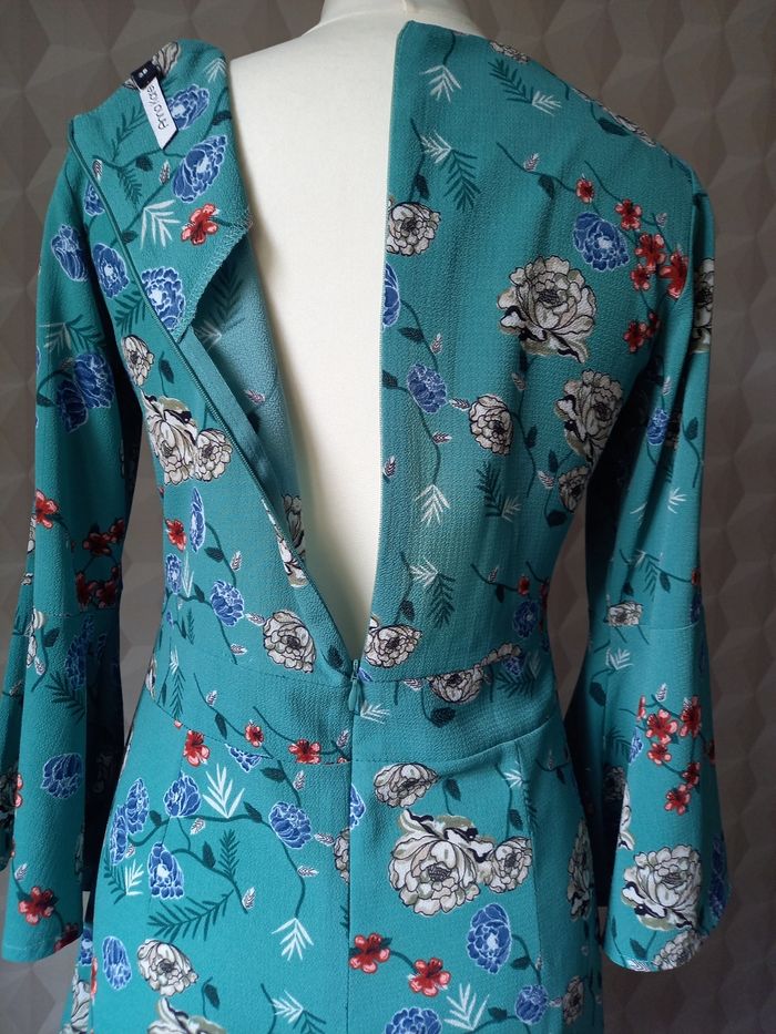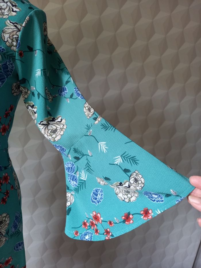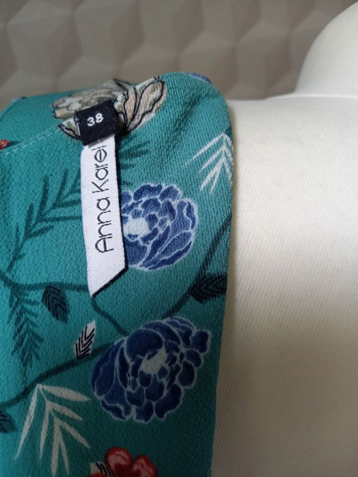 Très jolie robe fleurie sur fond vert d'eau Marque Anna Karel Taille 38 100%polyester Manches 3/4 finition évasé ,fine fermeture éclair au dos. Petit trou au bas de la robe côté droit sinon tres bon état.