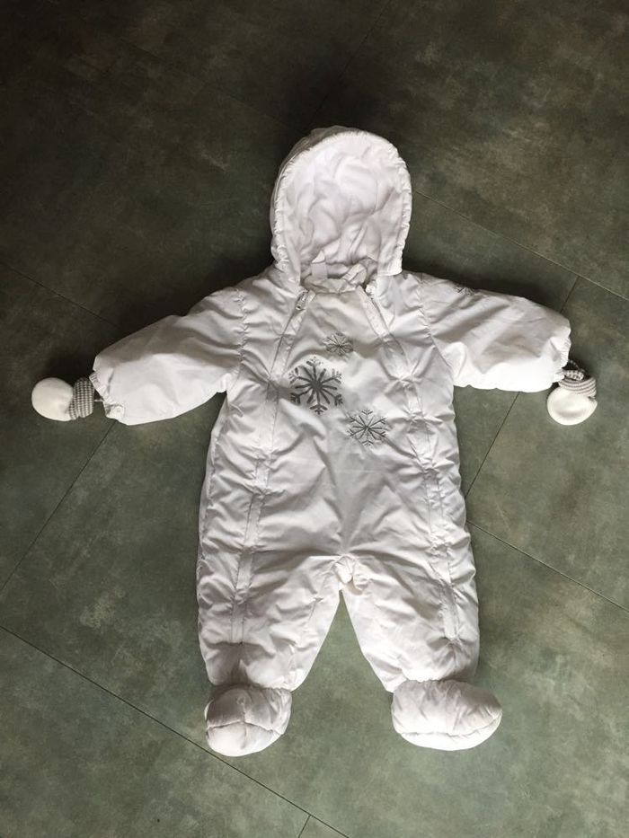 Bonjour, je vends cette combinaison unisexe blanche avec flocons argenté en 74 cm les moufles ont été rajoutées ce sont des style polaires non imperméables