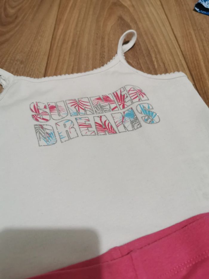 Ensemble été 2 débardeurs la halle et 3 leggings 3/4 3 ans neufs Collection 2021 2 débardeurs rose et blanc summer dreams neufs 3 ans la halle Taillent bien 3 leggings 3/4 3 ans kiabi Taillent bien arc bandes sur les côtés colorés et brillantes paillettes seul le jaune a une petite tache très légère présente sur une photo