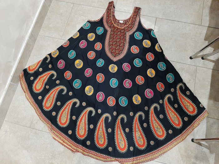 Robe d'été évasée noire motifs multicolores. Taille unique. 100% viscose.