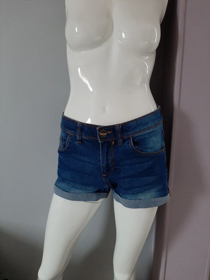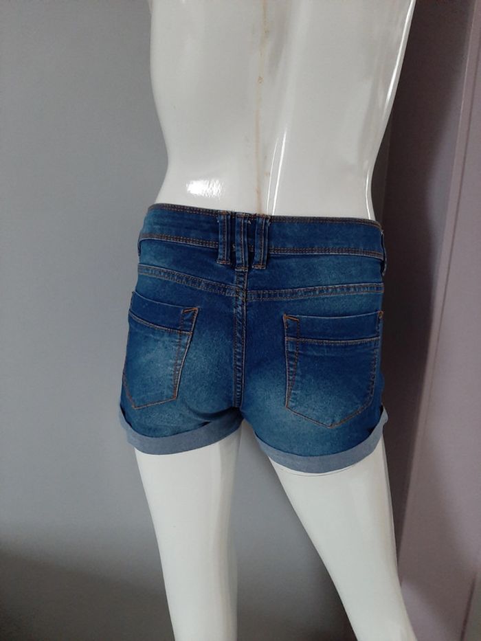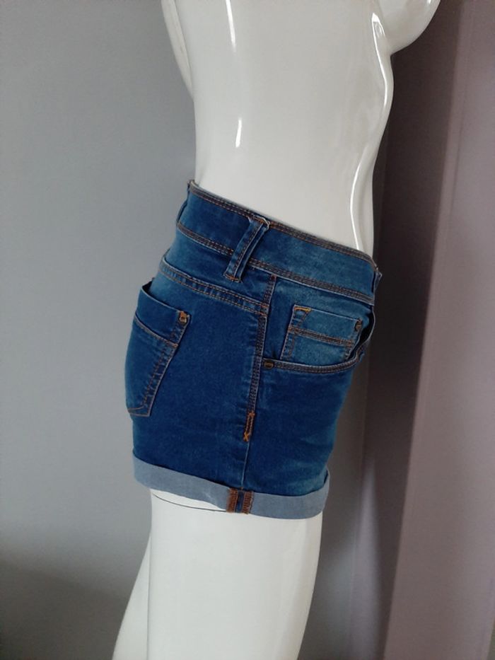 Short en jeans bleu foncé. Taille normale. Plis en bas. 70% coton, 28% polyester, 2% élasthanne. Taille S (36).