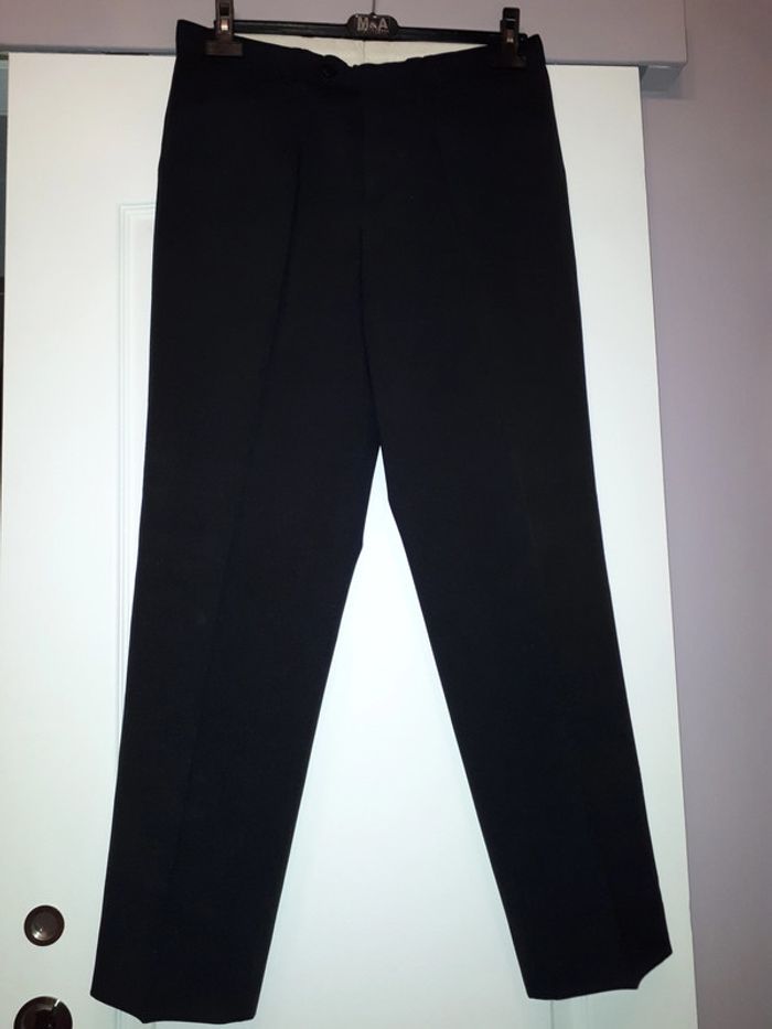 Costume noir (fines côtes). 90% polyester, 10% viscose. Pantalon: taille 42 et veste: taille 50. Comme neuf. La veste semble un peu grisée sur la photo à cause du flash (voir couleur du pantalon). Envoi possible.
