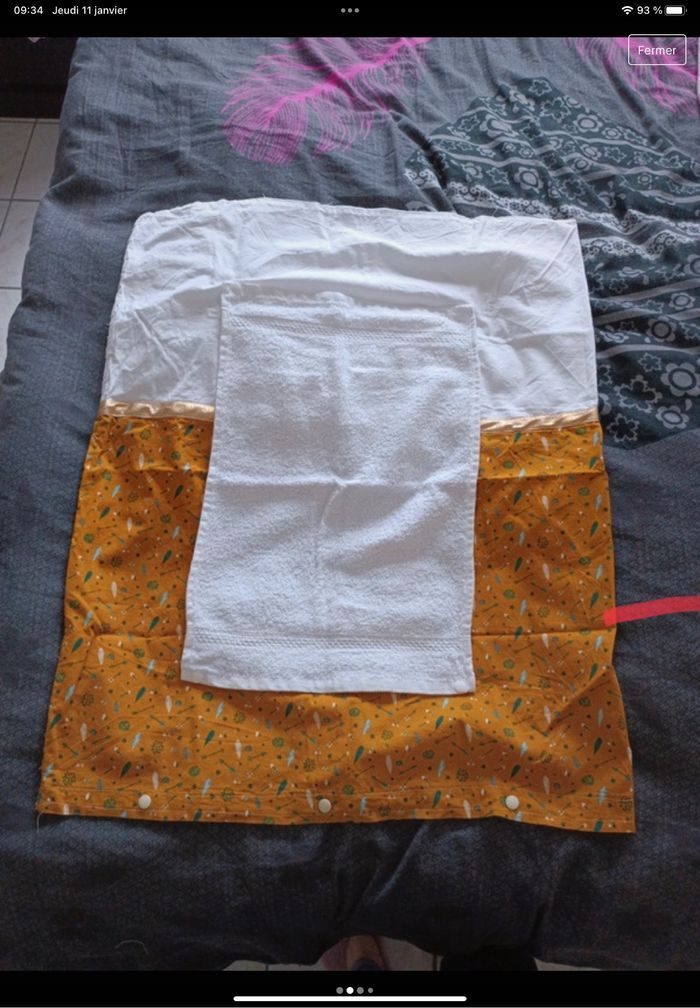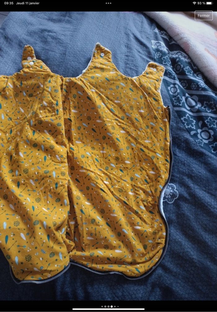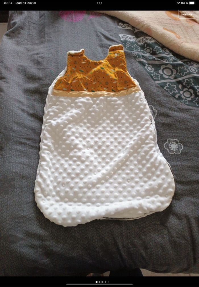 Vend ce lot de couture pour bébé qui comporte 1 protège carnet de santé 1 gigoteuse 55cm (fermeture dure depuis que je l’ai, trace sur le devant voir photo) 1 cape de bain 97cm (intérieur serviette éponge et extérieur tout doux) 1 housse de matelas à langer à pressions, vendu avec 3 serviettes pour le milieu. Défaut sur le moutarde voir photo (convient pour un matelas à langer 50x70cm) Fait main