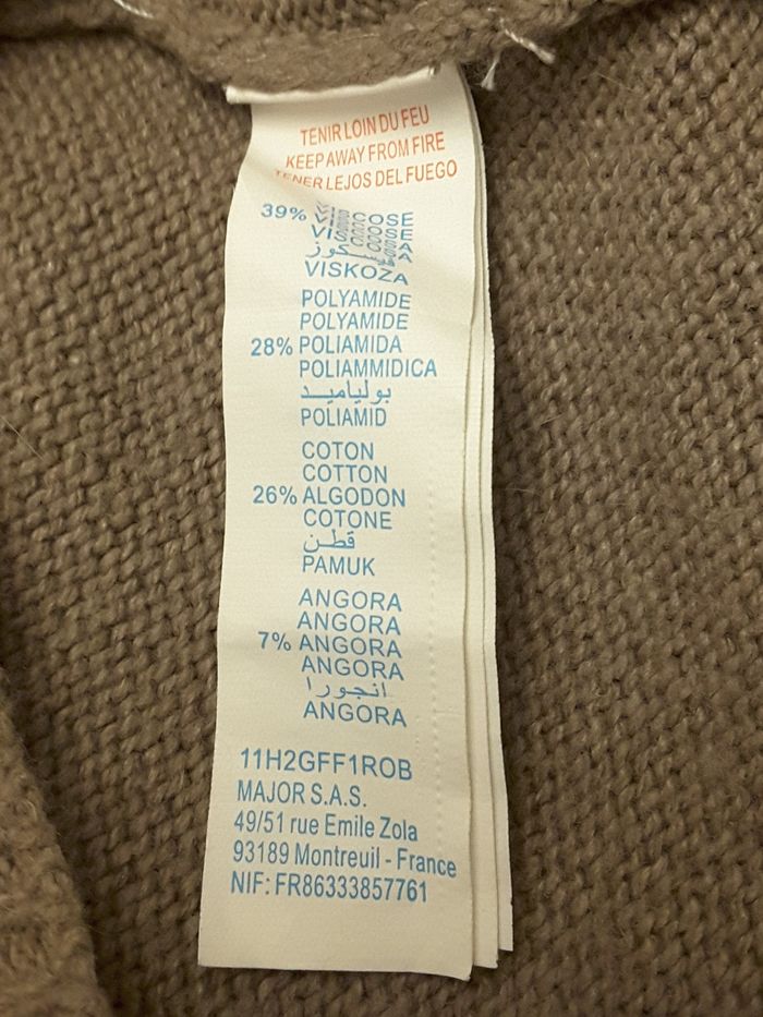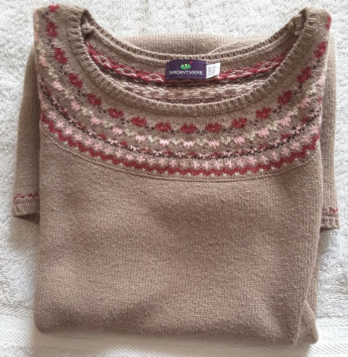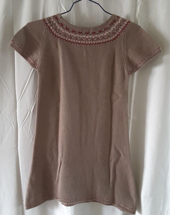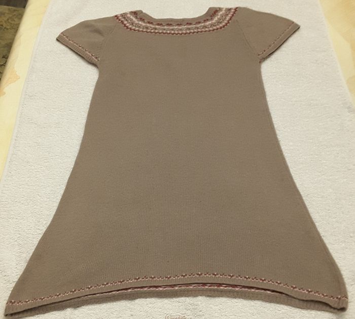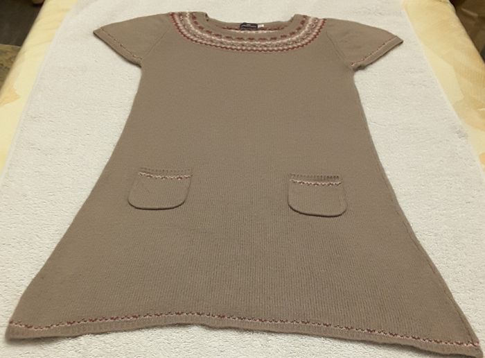 Robe en lainage marron, à manches courtes et 2 poches. Sergent Major – 12 ans Col brodé bordeaux, rose et écru. Longueur : 68 cm 39 % Viscose 28 % Polyamide 26 % Coton 7 % Angora Lavage à 30 ° Envoi rapide et soigné