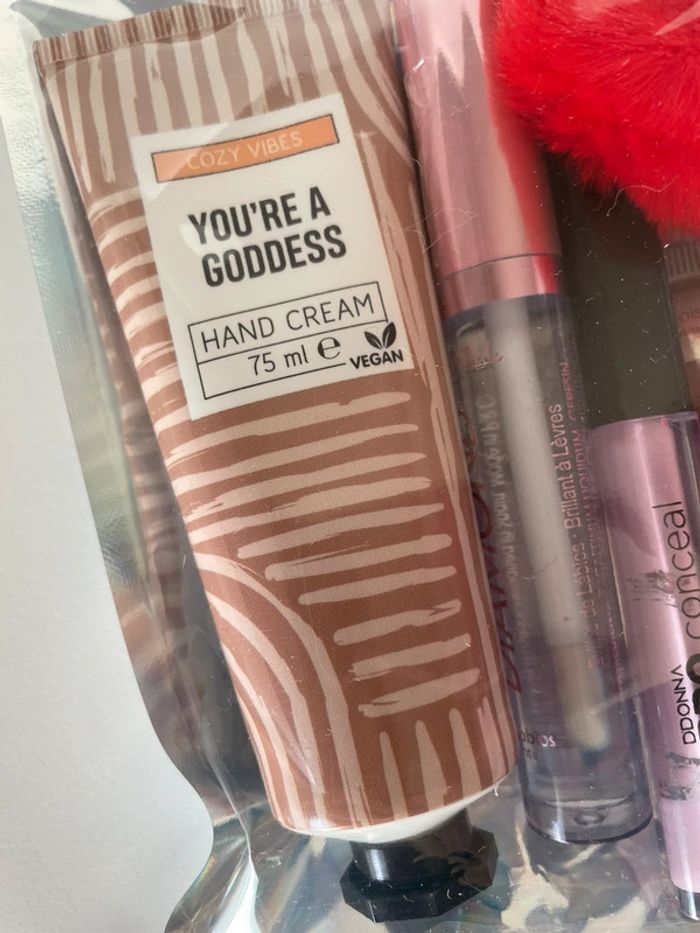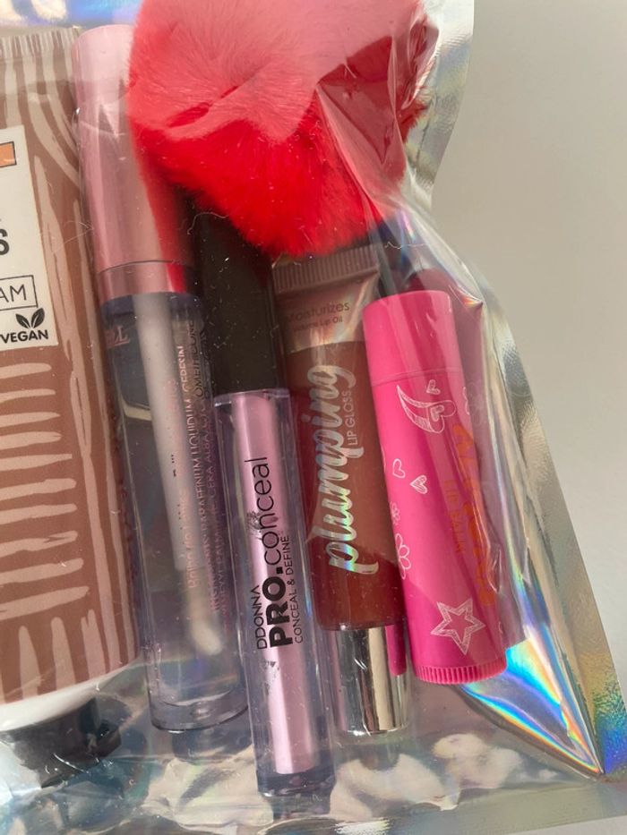 Jamais utilisé Le sachet est composé par: 1x crème pour les mains 2x gloss 1x baume à lèvres 1x pro.cancel 1x porte-clés pompon rouge