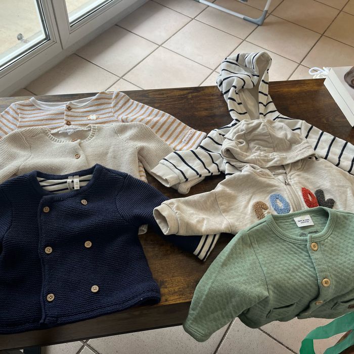 Lot de 6 gilets/vestes, taille 3 mois. 2 comporte le tampon avec le nom et prénom de mon bébé. Le bleu marine est épais. État parfait
