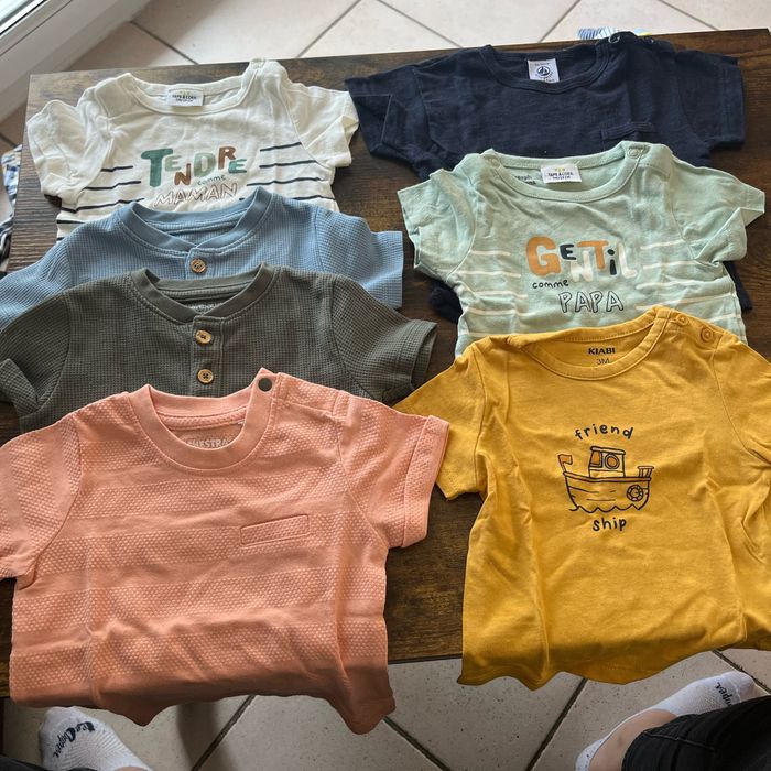Lot de 7 t shirts manches courtes. Taille 3 mois. État neuf sans étiquette. Plusieurs marques. Orchestra, verbaudet, kiabi , tape à l’œil et petit bateau.