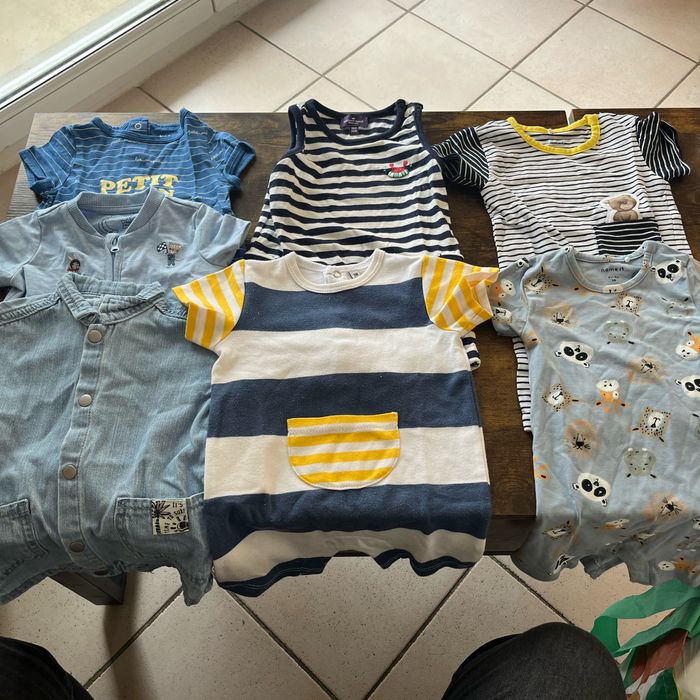 Lot de 7 combinaisons d’été en taille 3 mois, dont 2 name it en 4/6mois qui va parfaitement à un bébé qui porte du 3 mois. État parfait. 2 comporte le tampon avec le nom et prénom de mon bébé.