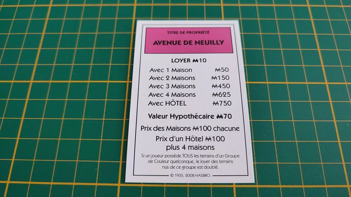 Titre de propriété Avenue de Neuilly pièce détachée jeu de société Monopoly parties rapides Hasbro #C25 Produit d'occasion Provient d'un Monopoly officiel Parties rapides avec le nouveau dé aux éditions Hasbro Référence interne : #C25 Présente des traces d'usures Vendu seule, vous achetez ce que vous voyez Expédition sous 24/48h maximum, hors dimanche et jours féries Produit emballé sous bulle (recyclé), envoi dans une enveloppe bulle ou colis très bien protégé (produit recyclé). Pour économiser vos frais de port pensez à regrouper vos achats !
