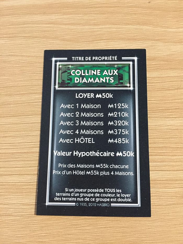 Carte titre de propriété Colline aux diamants pièce jeu de société Monopoly Millionnaire #A45