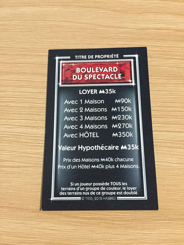 Carte titre de propriété Boulevard du spectacle pièce jeu de société Monopoly Millionnaire #A45