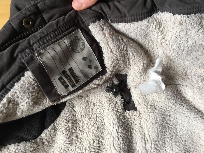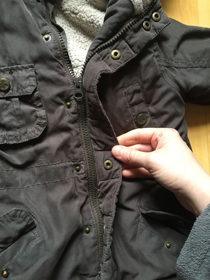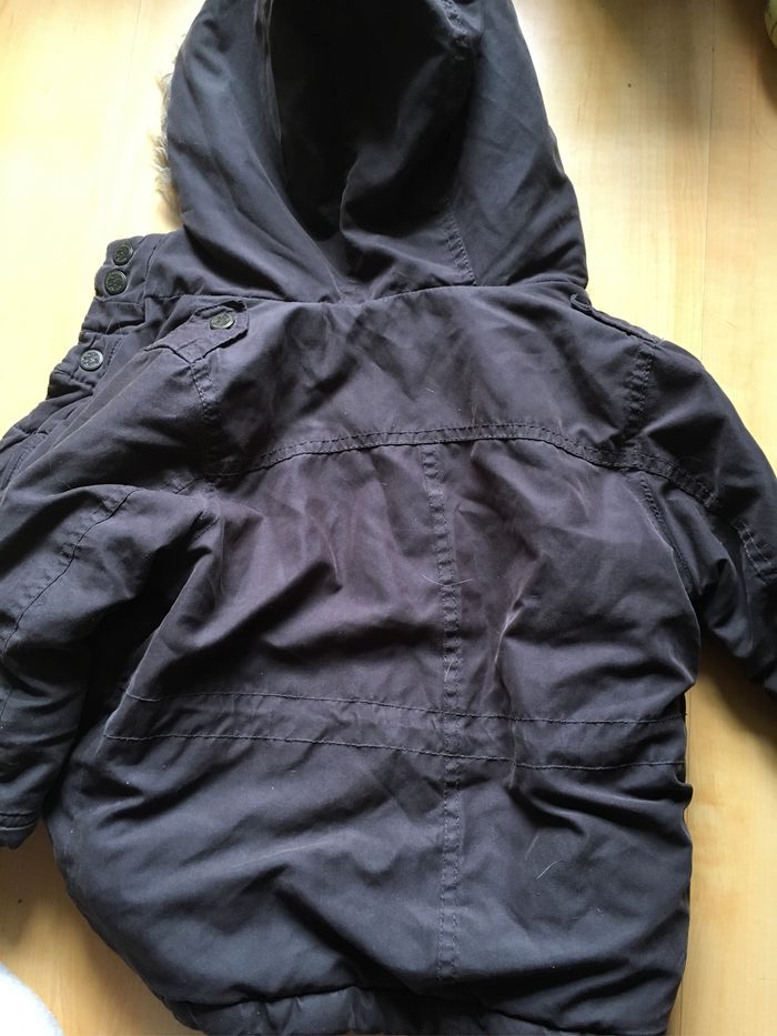Bien porté mais reste en très bon état, Très chaud avec sa capuche, Fermeture par pressions et fermeture éclair, Possibilité de resserrer à la taille