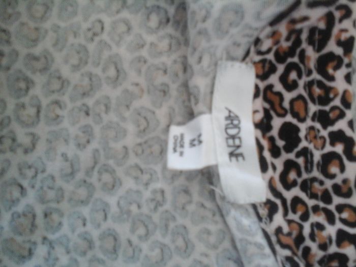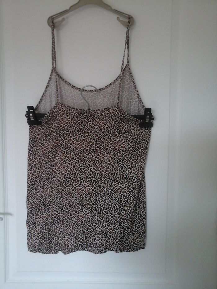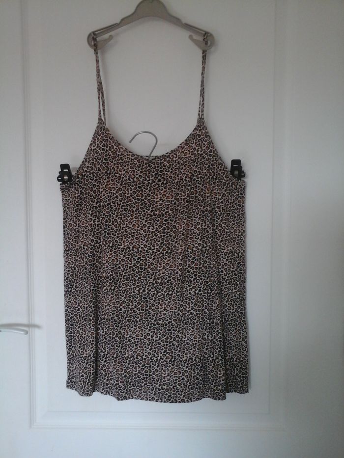 Blouse dos nu léopard Ardene 40, longueur totale 70 cm, largeur aisselles 40 cm, 85% rayonne, 5% spandex (élasthanne) — TBE