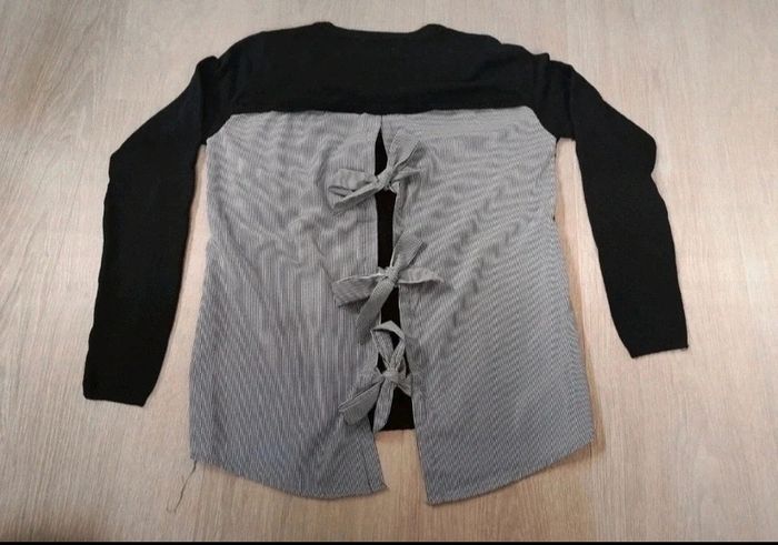 Pull avec noeud dans le dos marque season en taille M en très bon état voir comme neuf. Le tissus au dos a des rayures. Les nœuds peuvent se défaire et donc se faire selon la convenance de chacune.