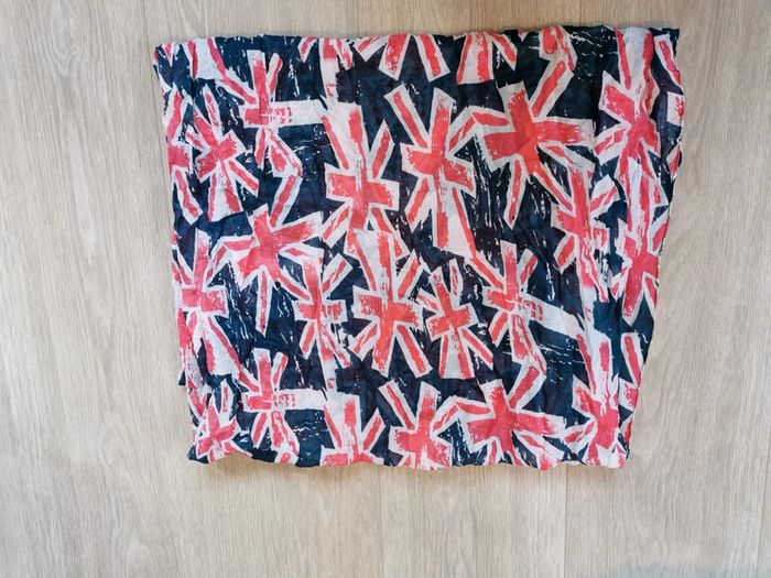 Châle motif étoile rouge sur fond bleu marine en très bon état