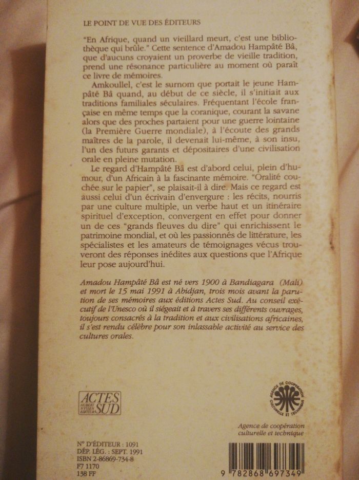 Mémoires de l'auteur africain Amadou Hampâté Bâ Amkoullel l'enfant peul