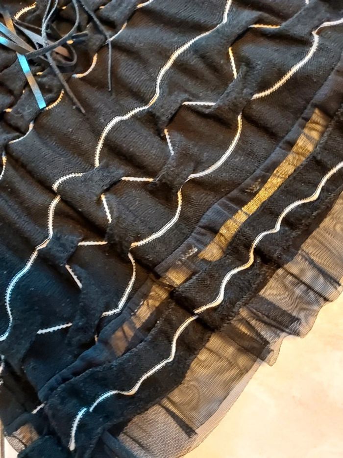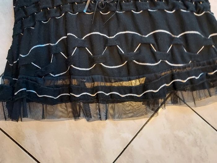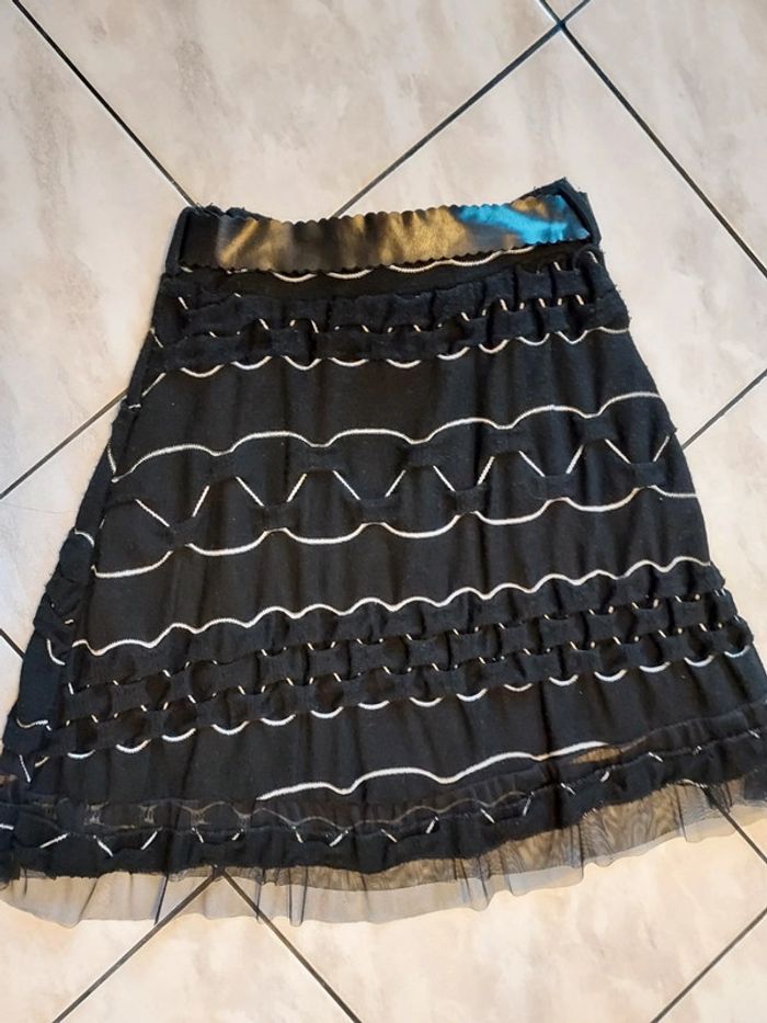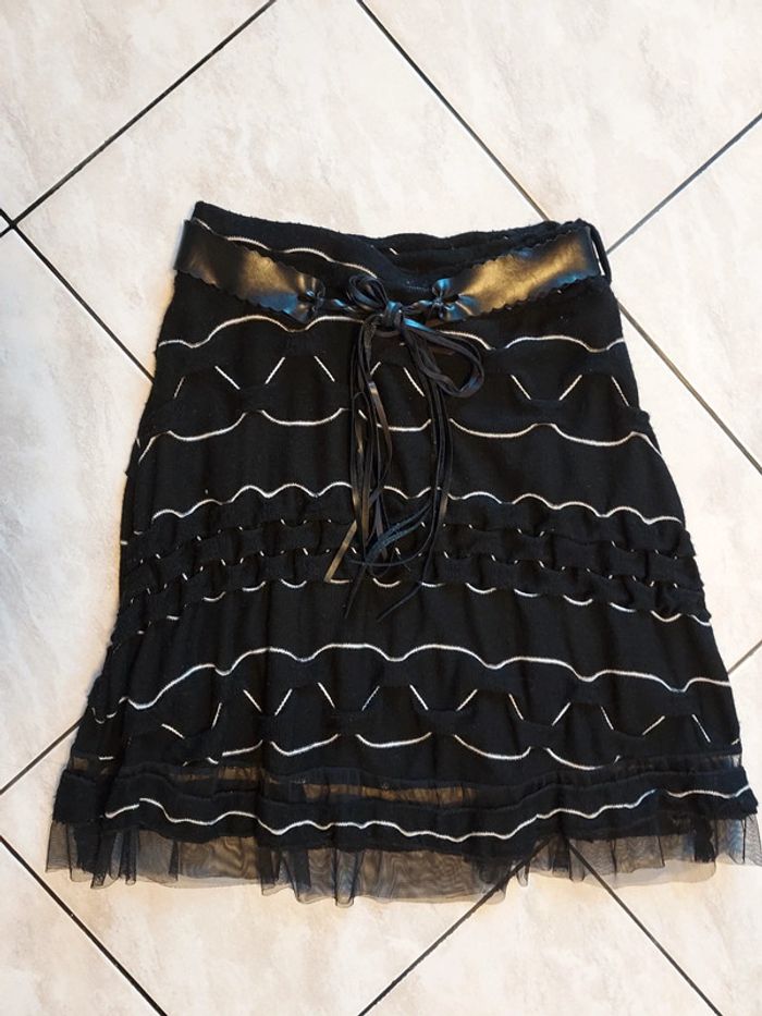 Jupe hiver taille élastique avec ceinture noire. Longueur genoux. Détails en tulle sur le bas. Noire avec liserés blancs. Excellent état