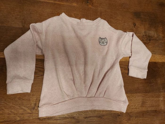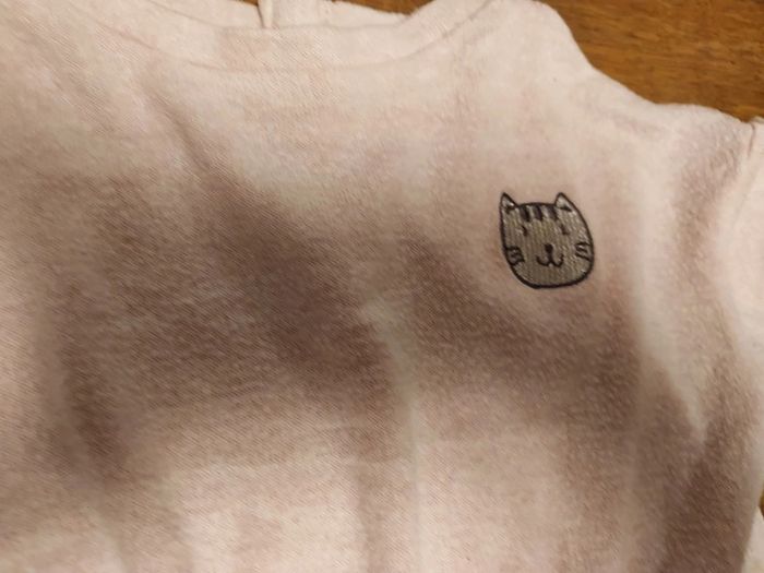 Pull large rose pâle avec tête de chat argentée. Taille 3 ans