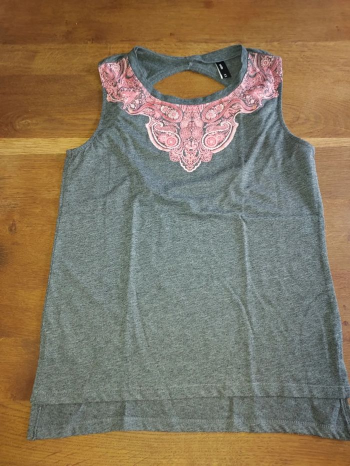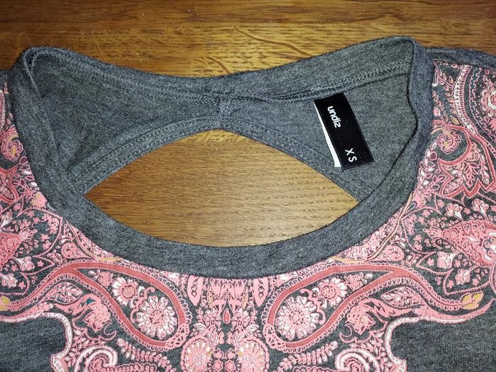 Top gris avec dessin rose et ouverture au dos. Taille XS