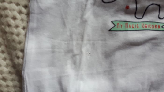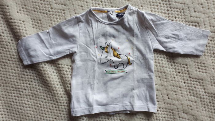 Deux t shirts blancs Kiabi taille 3 mois un sans manches avec volants aux épaules et motif pastèque pailleté et un manches longues motif licorne avec léger accros à l avant, voilà pourquoi je vend les deux ensemble