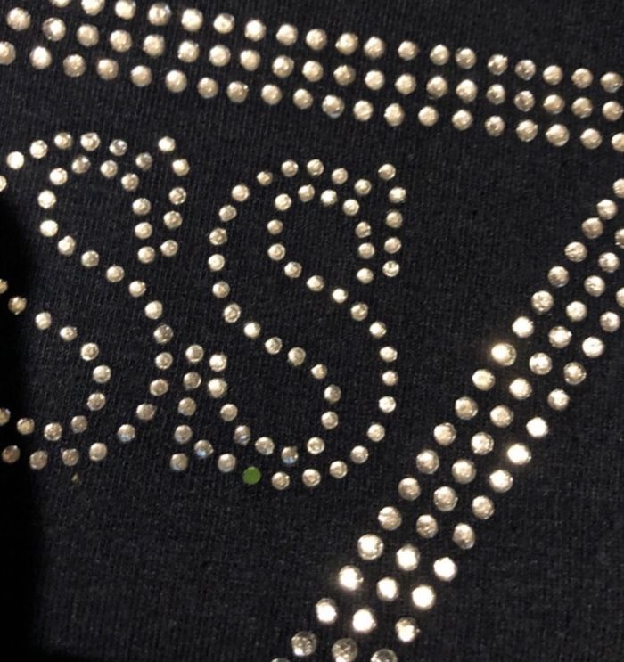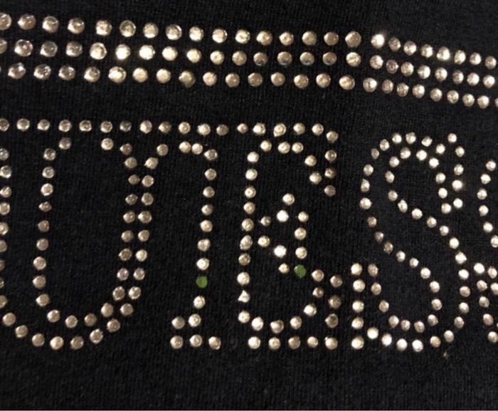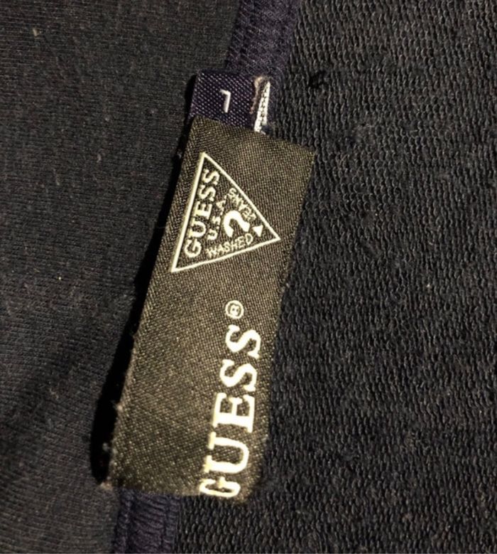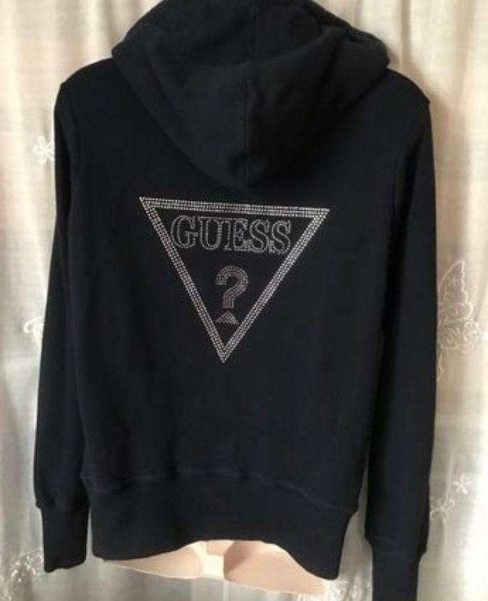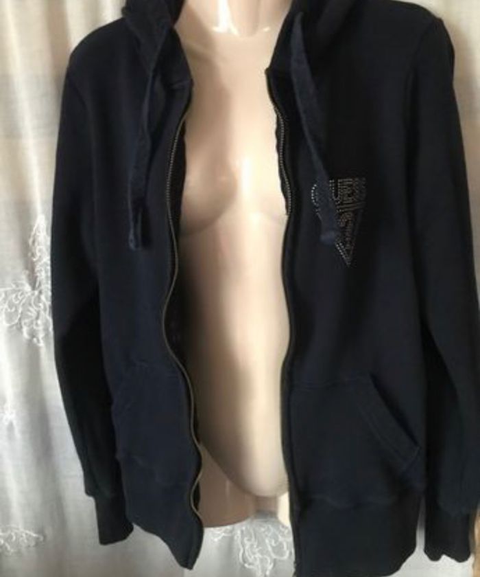 Superbe Gilet à capuche bleu nuit, en très bon état niveau couleur ( pas délavé) Guess Strass poitrine complet et dans le dos, Il manque 2 strass sur le E et un strass sur le S Taille L ou 40 Guess Le gilet n’a aucune étiquette concernant la composition ( coton ou viscose je pense)