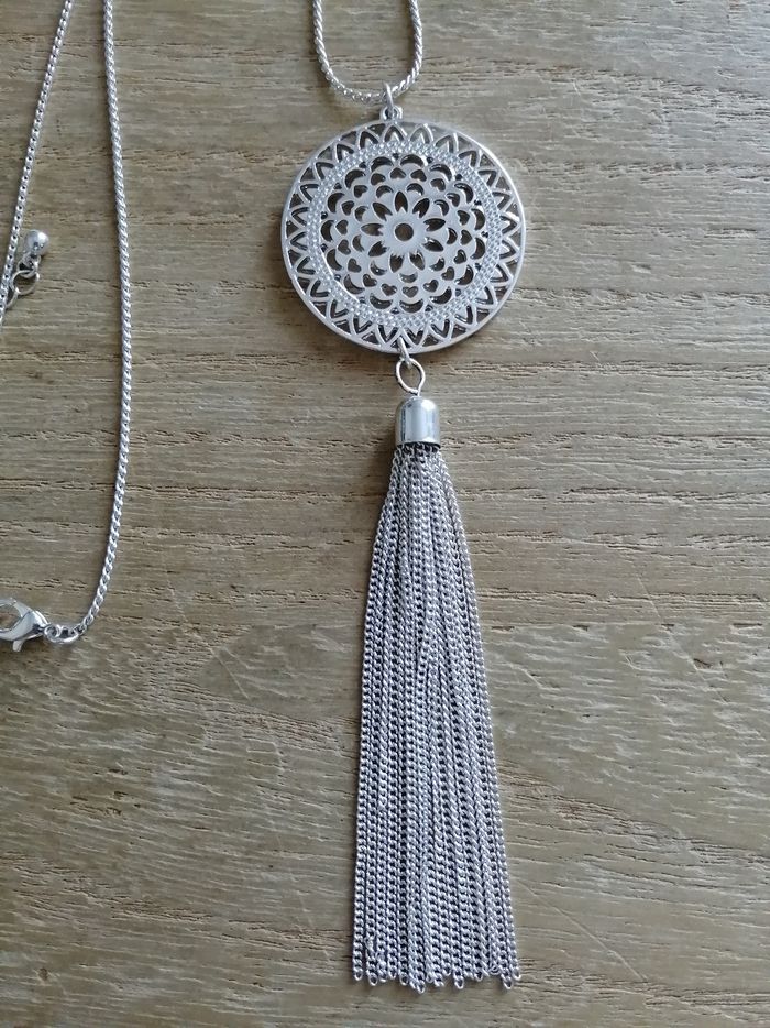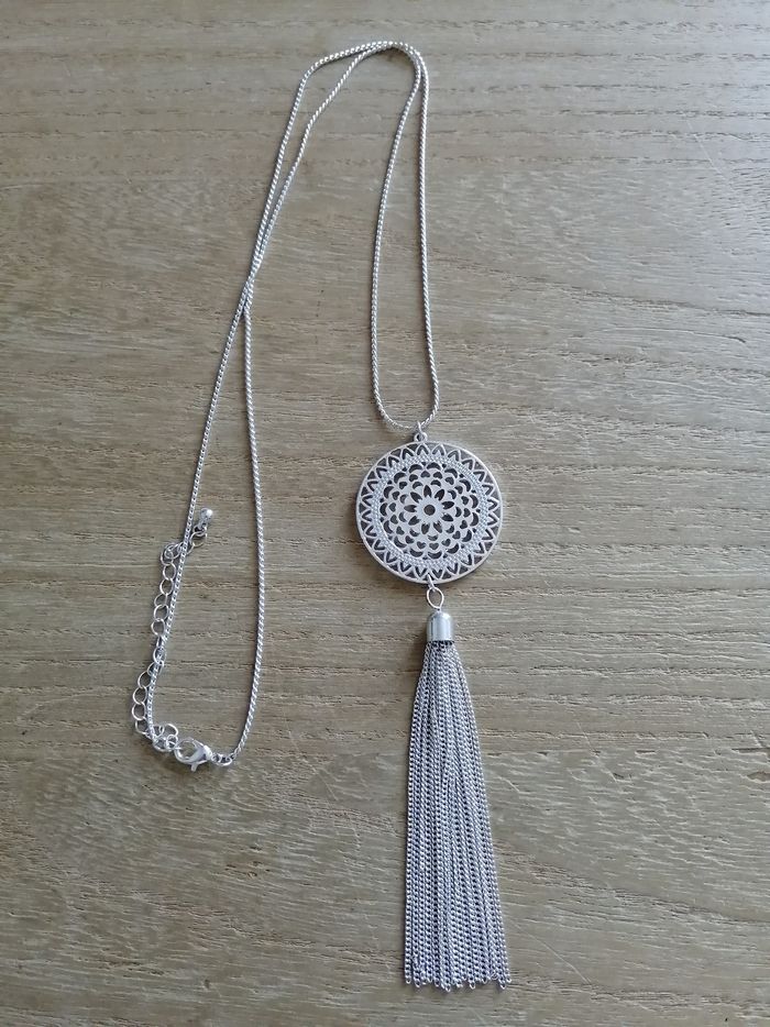 Collier long argenté pendentif rond ajouré avec chaînes pendantes neuf - photo numéro 1