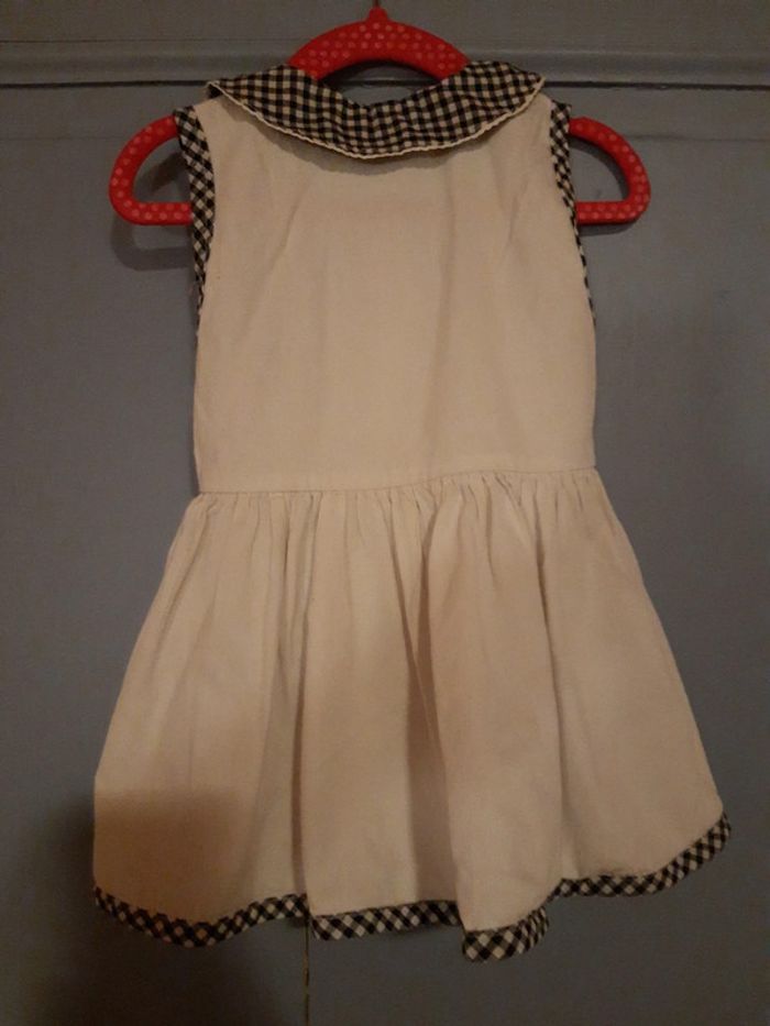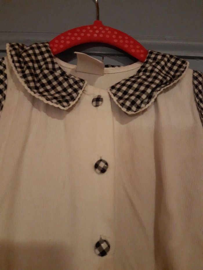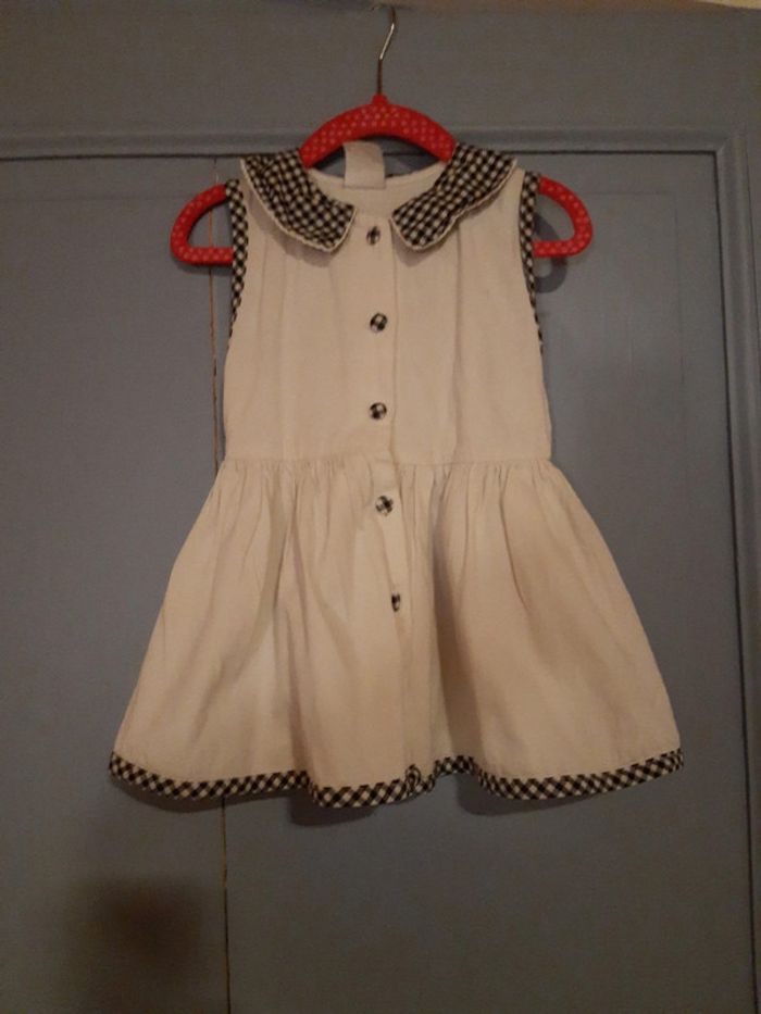 Adorable robe blanche avec carreaux noirs_blancs sur le col , les boutons et Liseret au niveau du bas et des bras. Très classe. Marque Zara je crois mais étiquette effacée. Correspond à du 2 ans Très peu portée car difficile avec notre météo des montagnes! Mes autres vêtements 24 mois: #pekou77vêtements24mois
