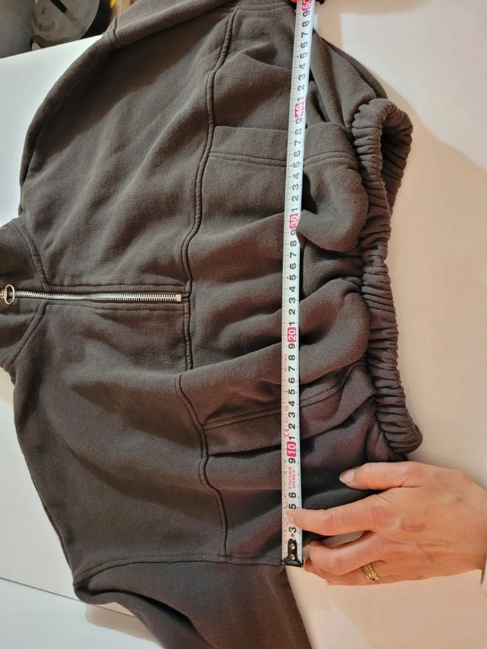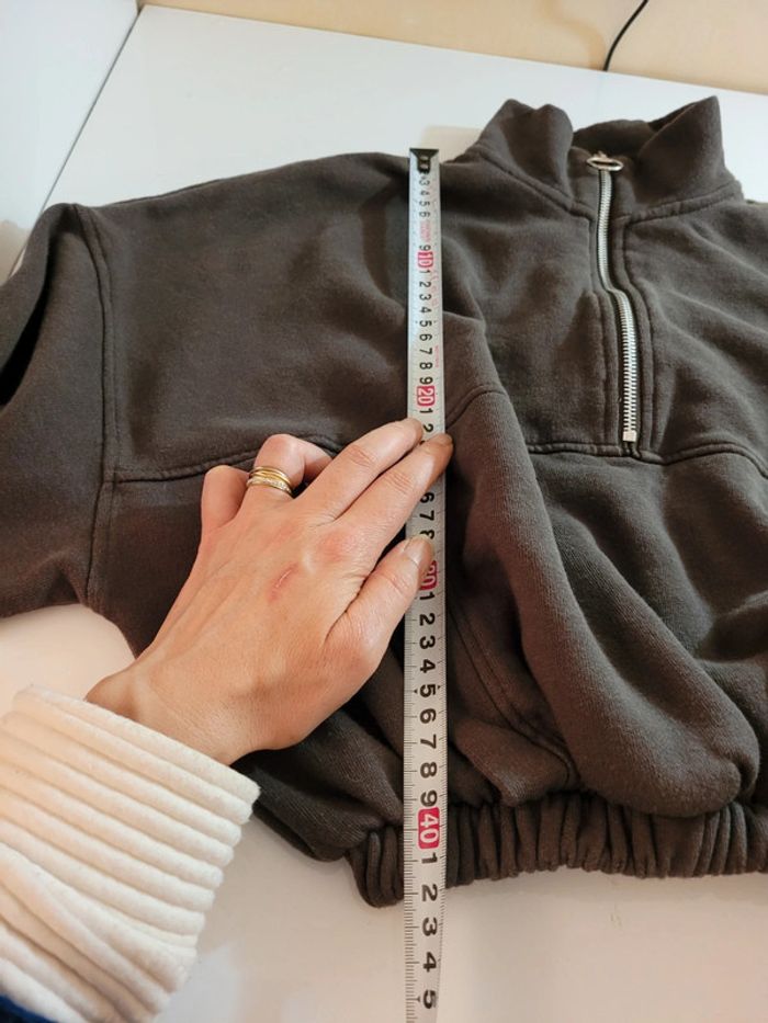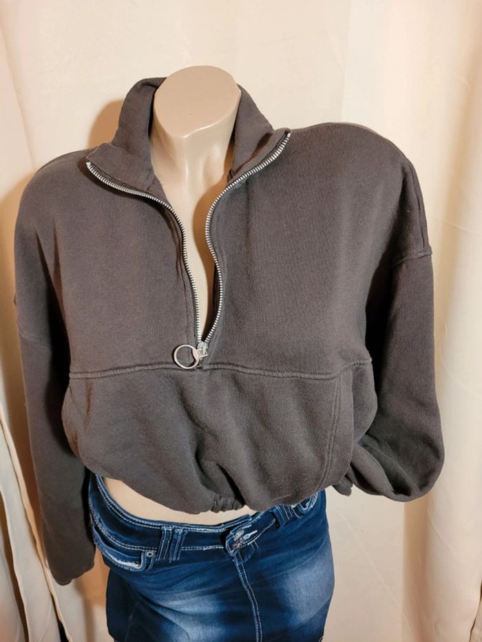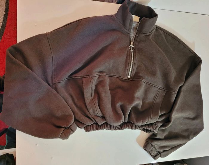 Pull sweat court, taille élastique, poches kangourou. Col fermeture éclair.